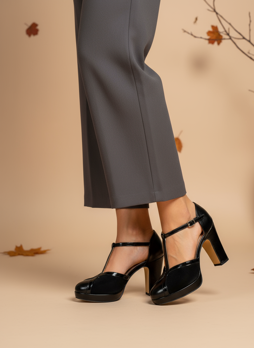 Tyto černé pantofle s T-páskem kombinují nadčasovou eleganci se stabilitou. Lesklý povrch dodává moderní nádech, zatímco silný podpatek zajišťuje pohodlí a rovnováhu při každém kroku. Ideální pár pro večerní vystoupení, ale také pro profesionální oblečení.