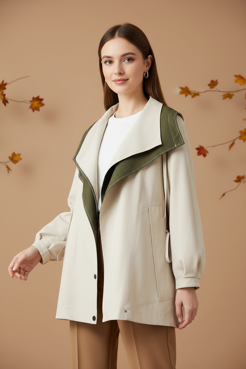 Větruodolná **bicolor bunda pro ženy** v odstínech khaki a krémové, která kombinuje minimalistickou estetiku s moderním charakterem. Disponuje širokými rukávy s elastikem, zipem a knoflíky pro dokonalé padnutí, stejně jako pohodlným střihem, který ji činí ideální pro stylové každodenní nošení. Její lehký materiál poskytuje svobodu pohybu a eleganci v každém vzhledu.
