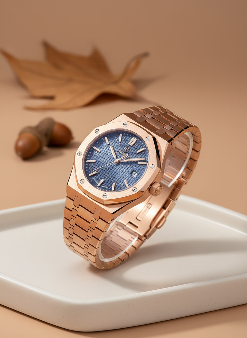 - Leštěné pouzdra z růžového zlata nebo nerezové oceli pro luxusní povrch.