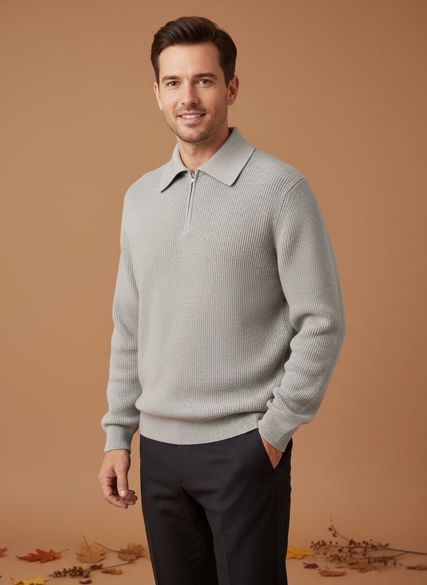 Tento svetr pro muže nabízí elegantní způsob, jak čelit chladu. Extrémně měkký na dotek, je vyroben ze 100% bavlny s elegantním texturovaným povrchem a zahrnuje všechny klasické detaily, včetně zipového límce, spadlých ramen a uvolněných dlouhých rukávů.